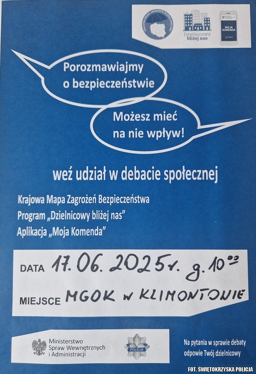 Aspirant Katarzyna Ciba, Komendant Komisariatu Policji w Koprzywnicy zaprasza do udziału w debacie społecznej pod hasłem „Porozmawiajmy o bezpieczeństwie, możesz mieć na nie wpływ – aktywny senior, bezpieczny senior”. Wydarzenie odbędzie się 17 czerwca 2025 r. o godzinie 10:00 w sali konferencyjnej budynku Miejsko-Gminnego Ośrodka Kultury w Klimontowie.