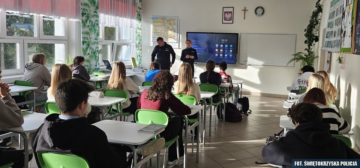 Podczas spotkań profilaktycznych policjanci podejmują szereg istotnych tematów, których celem jest podnoszenie świadomości młodych ludzi oraz kształtowanie odpowiedzialnych i bezpiecznych postaw. Funkcjonariusze rozmawiają z uczestnikami m.in. o odpowiedzialności karnej nieletnich, wyjaśniając, jakie konsekwencje prawne mogą wynikać z nieodpowiednich zachowań oraz łamania przepisów prawa. Dzisiaj poruszali te ważne tematy z uczniami Szkoły Podstawowej w Zawichoście.