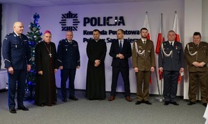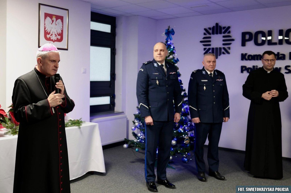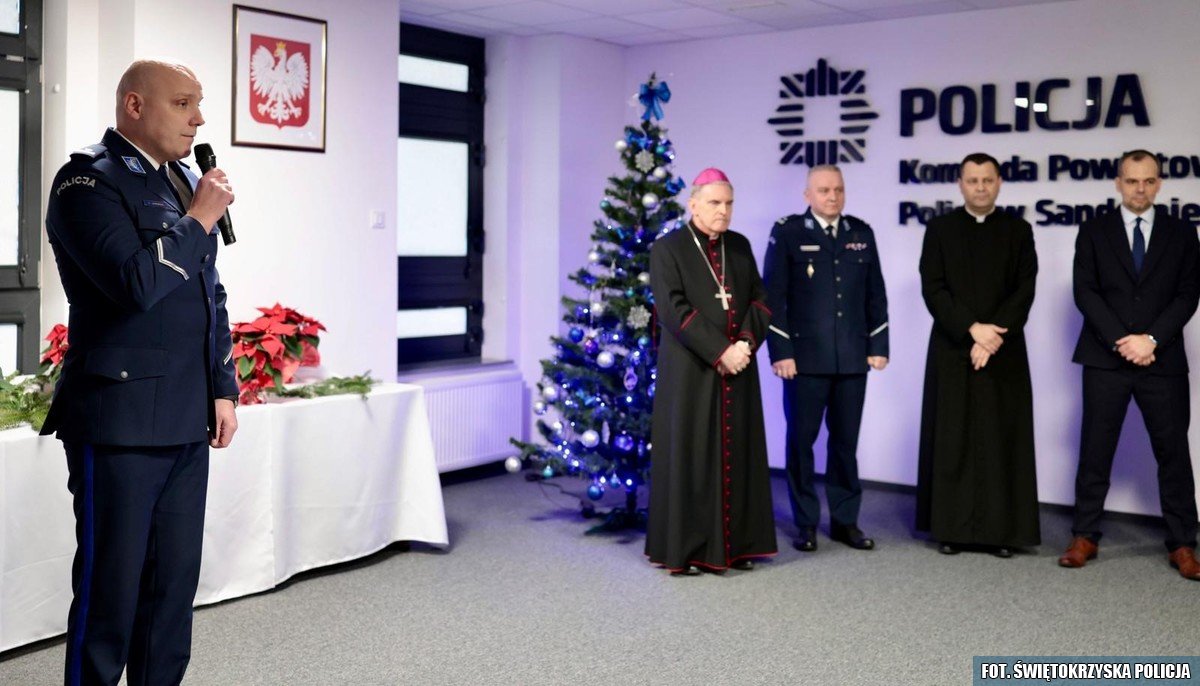 Szef sandomierskich funkcjonariuszy podinsp. Grzegorz Jaworski po przywitaniu przybyłych gości, podziękował policjantom oraz pracownikom za ogromny wysiłek i zaangażowanie w codziennej służbie i pracy oraz złożył zgromadzonym życzenia z okazji nadchodzących Świąt Bożego Narodzenia. Wszelkiej pomyślności życzył także Jego Ekscelencja Ksiądz Biskup Sandomierski Krzysztof Nitkiewicz, który tradycyjnie poświęcił wigilijny opłatek.