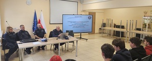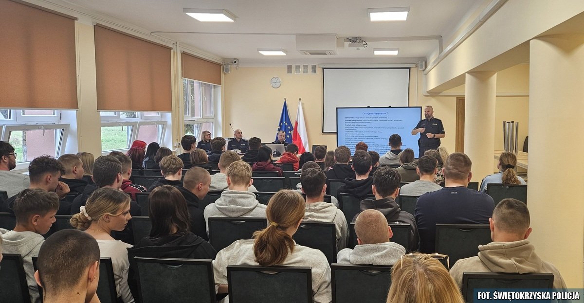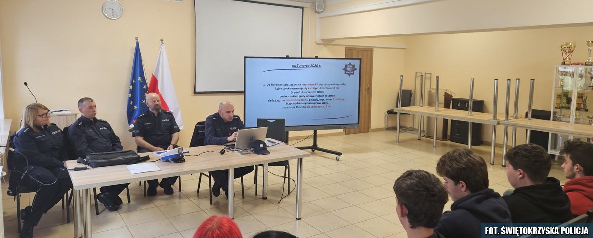 Obecny na spotkaniu funkcjonariusz Wydziału Ruchu Drogowego sandomierskiej jednostki przedstawił uczestnikom najnowsze przepisy obowiązujące w ruchu drogowym od 2026 roku, wyjaśniając ich praktyczne zastosowanie.